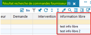 Dans les résultats de recherche de commandes fournisseur (Gestion > Achats > Commandes fournisseurs), de cotations (Gestion > Achats > Cotations) et de factures fournisseur (Gestion > Achats > Factures), la colonne Information libre a été ajoutée. Pour chaque résultat, elle affiche le texte renseigné dans le champ Information libre visible depuis les détails de chaque ligne des pièces concernées.