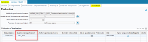 Dans l'onglet Evaluation, le champ Modèle de questionnaire participant a été déplacé dans le tableau Périodes d'évaluation sous la forme d’une colonne nommée Questionnaire participant dans laquelle il est possible de renseigner un modèle de questionnaire participant. Pour chaque période d’évaluation, un modèle de questionnaire différent peut donc être sélectionné. Si plusieurs périodes d’évaluation sont en cours et que le modèle de questionnaire participant est différent pour chaque période, les participants pourront accéder à chacun des questionnaires sur le Portail Formation.