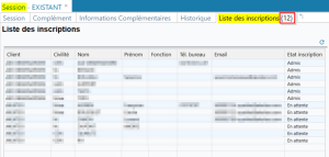 Depuis une session (Formation > Sessions), l'onglet Liste des inscriptions affiche désormais entre parenthèses le nombre total d'inscriptions (quel que soit leur état) dans le nom de l'onglet.