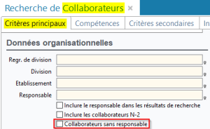 - Dans l’onglet Critères principaux, il est maintenant possible de cocher Collaborateurs sans responsable sous la section Données organisationnelles afin de rechercher les collaborateurs qui n’ont aucun responsable hiérarchique renseigné sur leur fiche.
