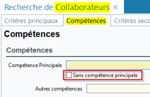 - Dans l’onglet Compétences, il est maintenant possible de cocher Sans compétence principale afin de rechercher les collaborateurs qui n’ont aucune compétence principale renseignée sur leur fiche.