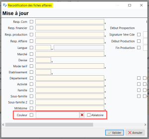 Cochez les données personnalisées à modifier et renseignez une valeur pour chaque élément coché. Une fois les données personnalisées cochées et renseignées, cliquez sur Valider pour prendre en compte les modifications.