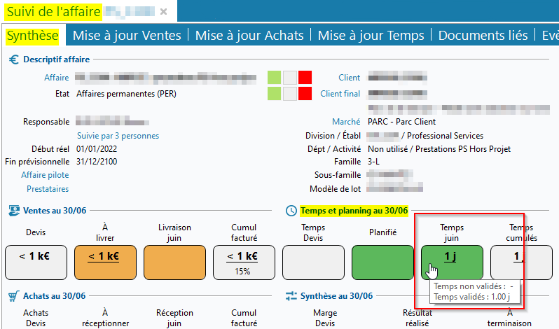 Dans la synthèse du suivi d'une affaire (Gestion > Affaires), accessible depuis une affaire dans Edition > Suivi de l'affaire > onglet Synthèse, la cellule Temps ... dans la section Temps et planning au ../.. est :