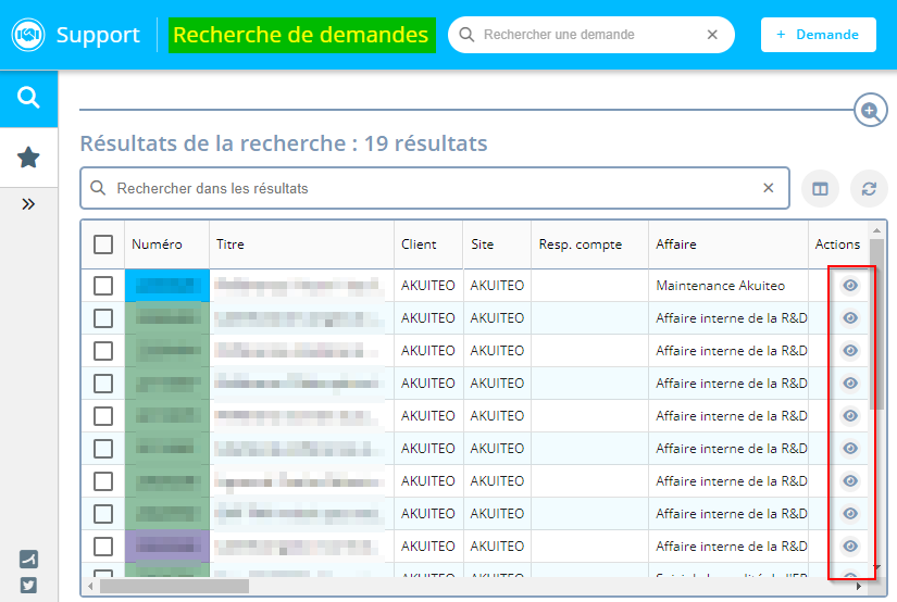 Auparavant, pour ouvrir une demande depuis les résultats de recherche de demandes, il fallait cliquer sur le numéro de la demande. Cette méthode n'est plus disponible et il faut désormais cliquer sur la nouvelle icône située à droite de chaque résultat de recherche dans la colonne Actions.