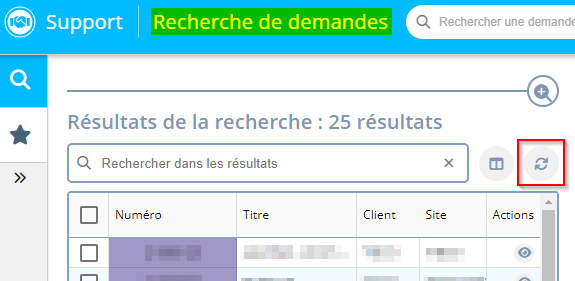 Dans les résultats de recherche de demandes, l'icône a été ajoutée en haut à droite du tableau de résultats afin de pouvoir rafraîchir les résultats. L'icône est affichée uniquement après avoir lancé la recherche.