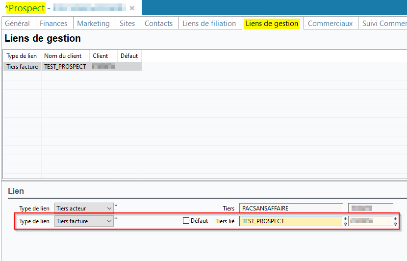 Auparavant, dans l'onglet Liens de gestion d'un prospect (Tiers > Clients / Prospects), un prospect ne pouvait pas être ajouté en tant que lien de gestion. Désormais, il est possible de lier un prospect.