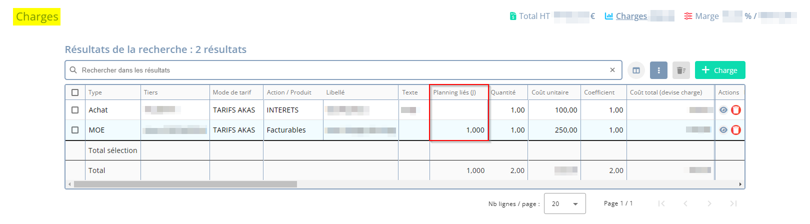 - Soit depuis le détail d'une ligne > onglet Charges ;
