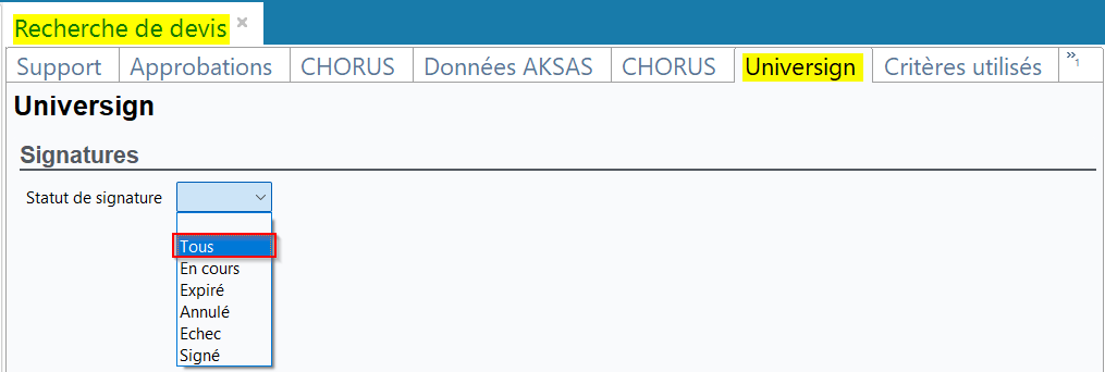Désormais, dans l'écran de recherche des devis, la valeur Tous a été ajoutée pour le critère Statut de signature (Gestion > Ventes > Devis > onglet Universign). Lorsque cette valeur est sélectionnée, les résultats de recherche affichent tous les devis ayant un statut de signature Universign, quel que soit ce statut.