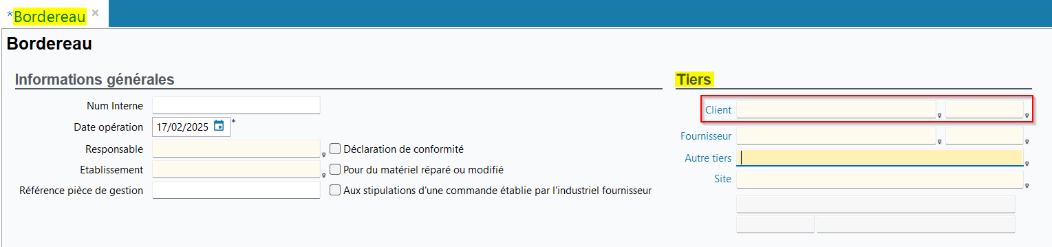 Désormais, les bordereaux peuvent être également liés à des prospects. Dans la fiche d'un bordereau > section Tiers, le champ Client permet de renseigner un client ou un prospect. De plus, dans l'écran de recherche des bordereaux, le champ Client (onglet Critères principaux) permet également de rechercher des prospects.