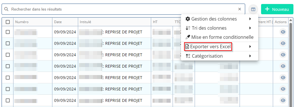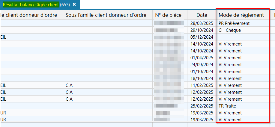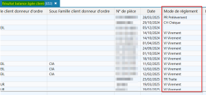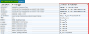 Désormais, la colonne Conditions de règlement a été ajoutée dans les résultats de recherche des affaires (Gestion > Affaires) et indique le mode de règlement renseigné sur la fiche affaire correspondante (onglet Informations secondaires > section Conditions contractuelles de règlement).