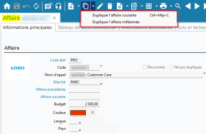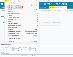 de la barre d'action. Ce menu contient désormais la nouvelle fonction Dupliquer l'affaire millésimée et la fonction Dupliquer l'affaire courante déjà existante.