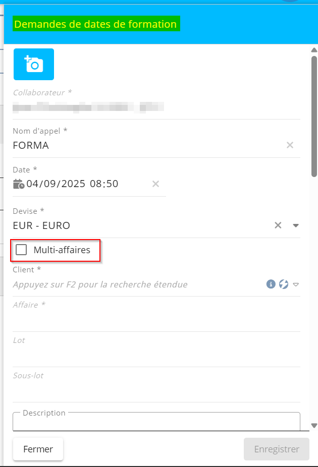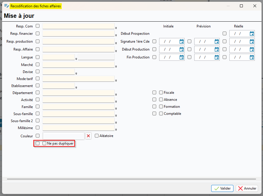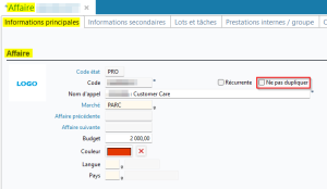 Sur une fiche affaire > onglet Informations principales > section Affaire, l'option Ne pas dupliquer a été ajoutée et est affichée uniquement si l'affaire comporte un millésime.