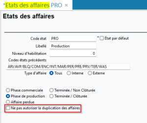 L'option Ne pas autoriser la duplication des affaires a été ajoutée sur le paramétrage des codes état des affaires (Outils > Paramétrage > Paramétrage Général > Affaire > Code état affaires). L'option est décochée par défaut.