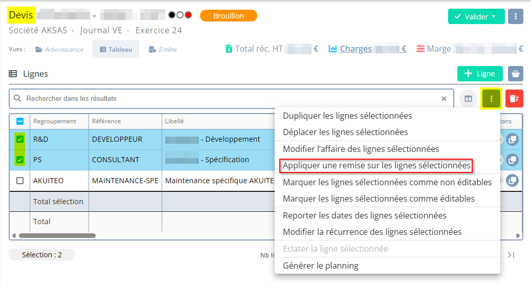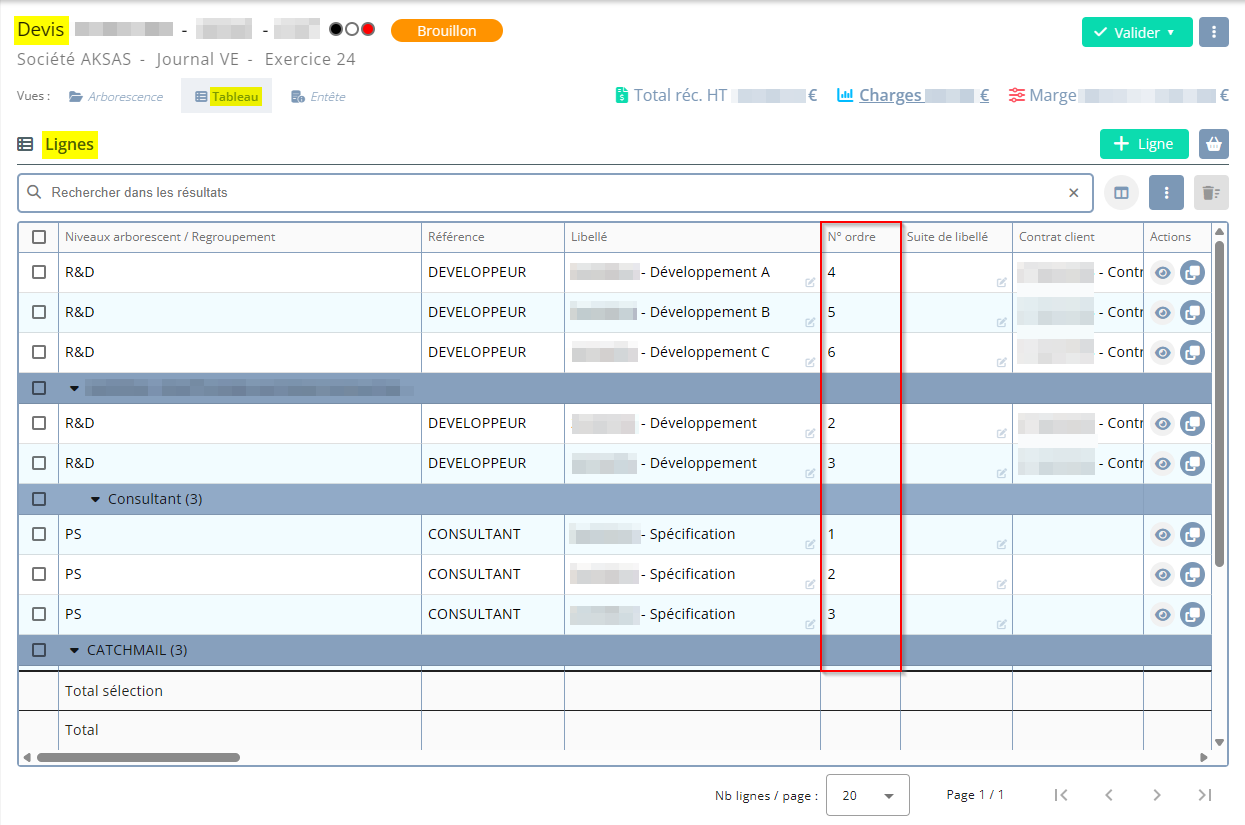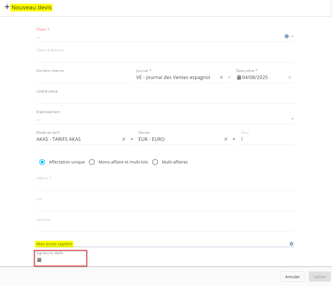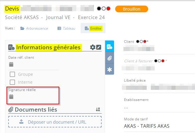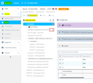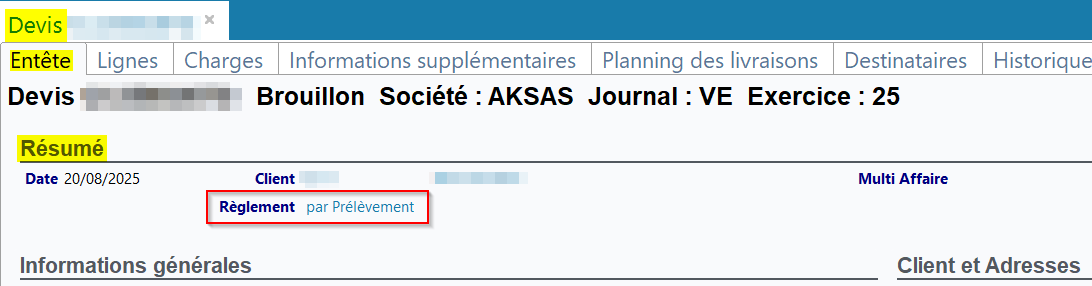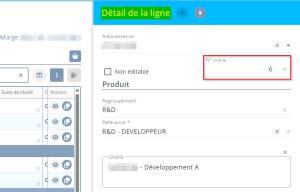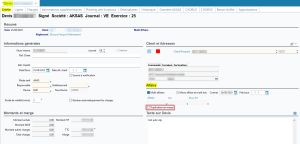 - Sur les lignes de devis (Gestion > Ventes > Devis puis onglet Lignes > détail d'une ligne > section Détails) et les entêtes de devis (onglet Entête > section Affaire).