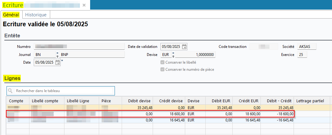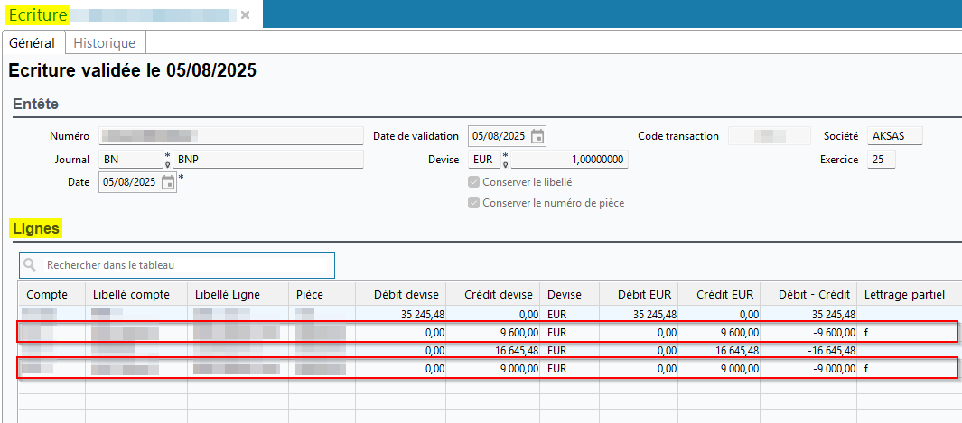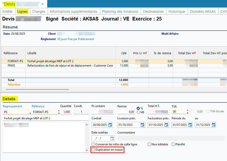 - Si la case Duplication en masse est cochée sur l'entête de la pièce, les lignes pour lesquelles la case Duplication en masse est cochée sont dupliquées lors de la duplication des affaires millésimées.