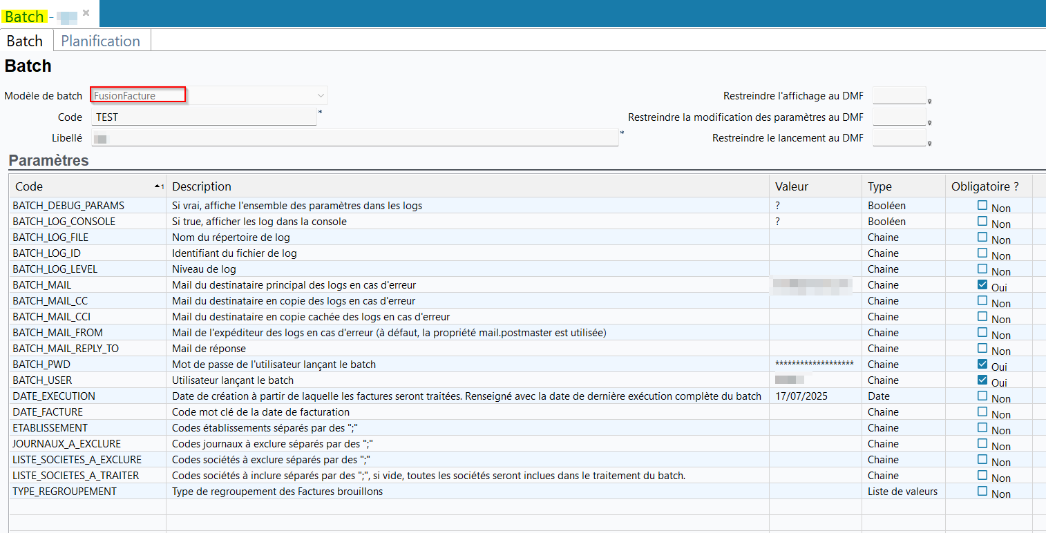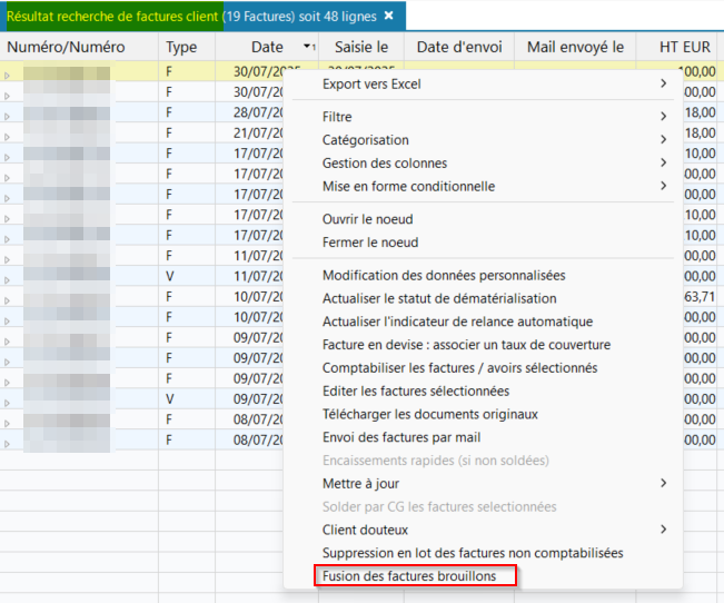 La fonctionnalité Fusion des factures brouillons (Gestion > Ventes > Factures) et le batch FusionFacture (Outils > Paramétrage > Batchs > Batch création et modification) permettent de fusionner des factures de vente externes non comptabilisées de la société en une seule facture brouillon, selon les critères de regroupement choisis.