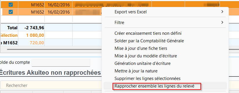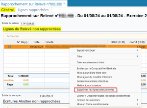 Le module de gestion des relevés bancaires (Comptabilité > Rapprochement bancaire > Gestion des relevés bancaires) permet de rapprocher des lignes de relevé bancaire avec des lignes d'écritures présentes dans Akuiteo.