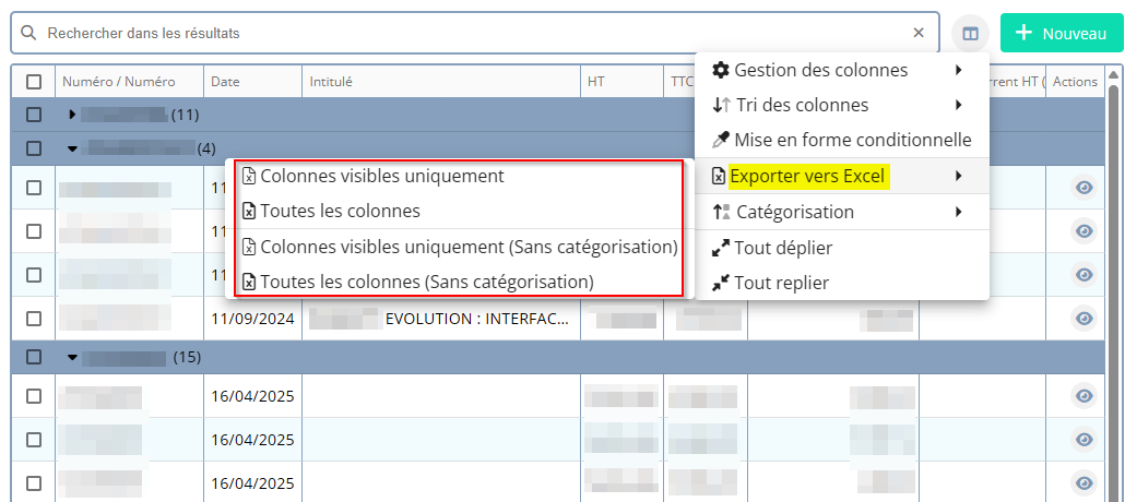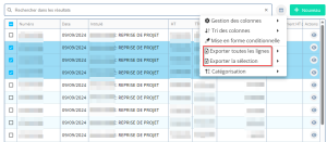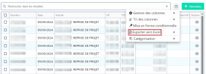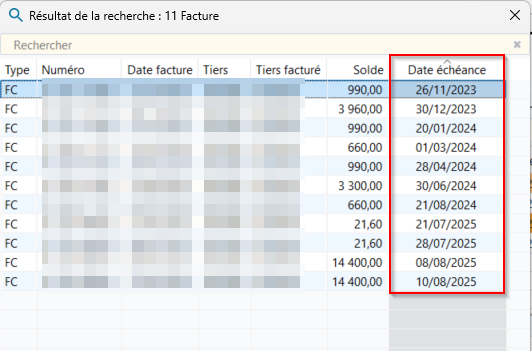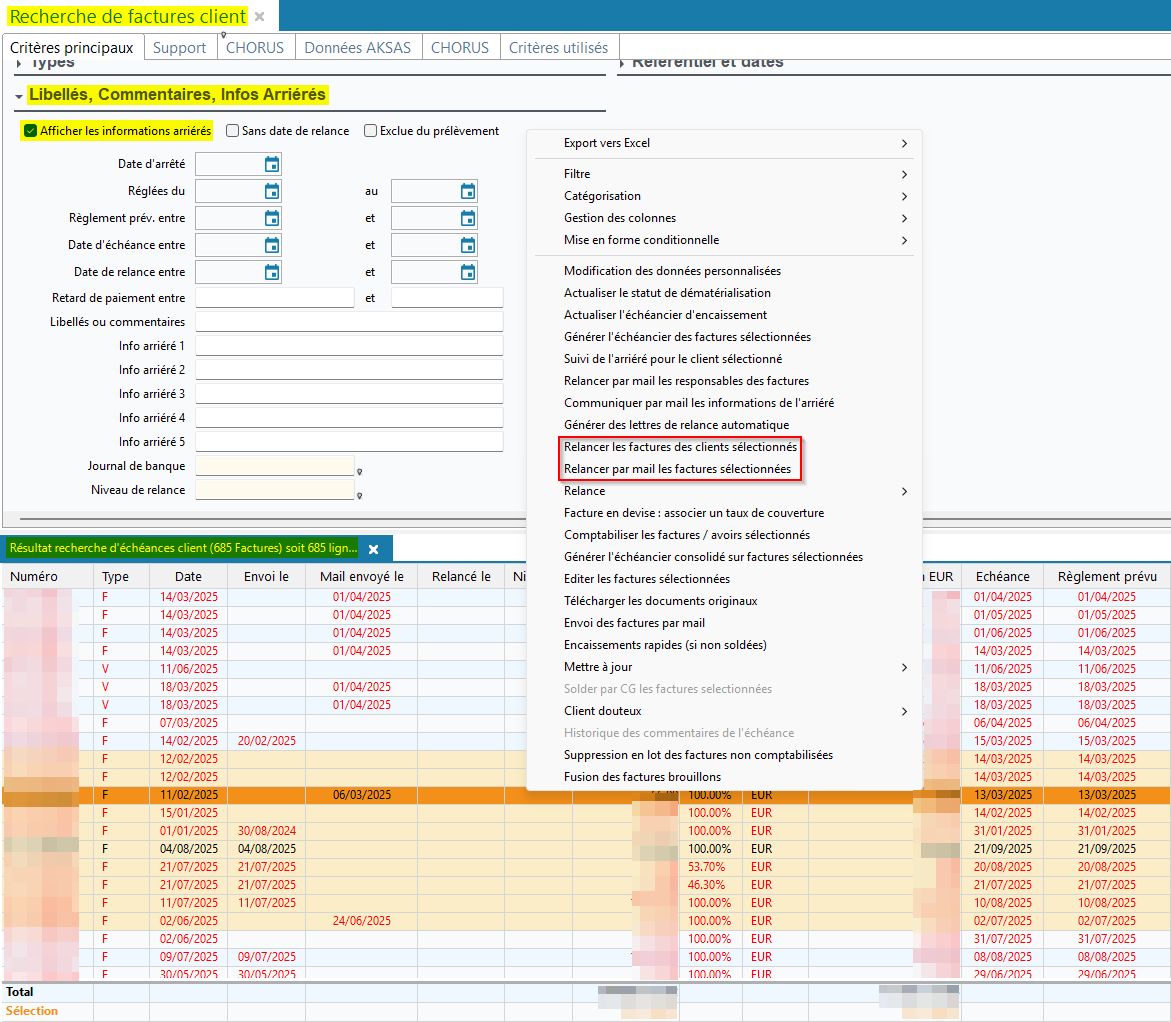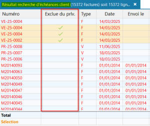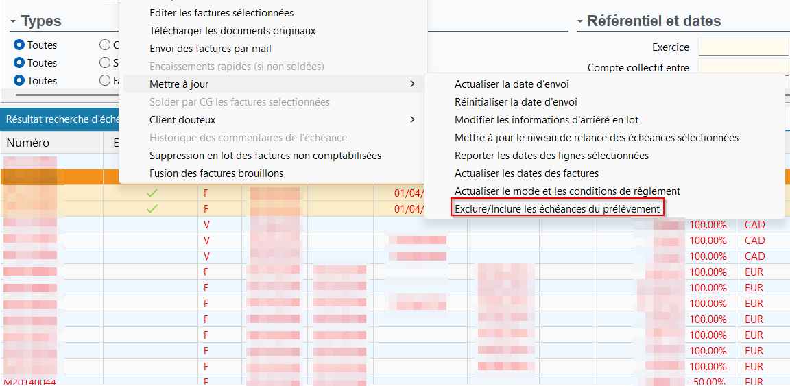 Enfin, la fonction Exclure/Inclure les échéances du prélèvement (clic droit depuis une sélection de lignes d'échéances client > Mettre à jour) est disponible depuis les résultats de recherche des échéances client. Elle permet d'exclure ou d'inclure en lot les échéances sélectionnées des prélèvements à venir.