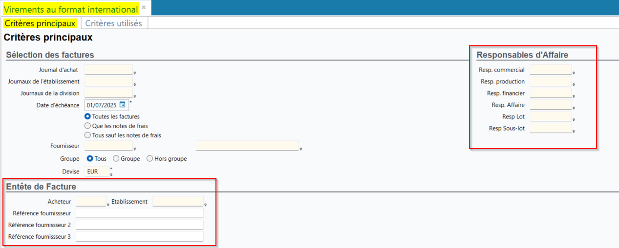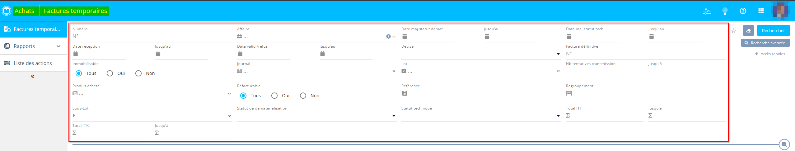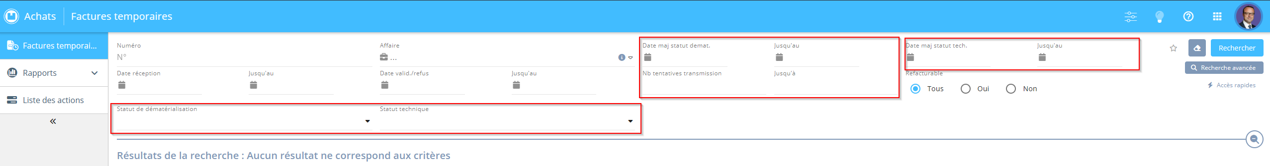 Le Statut de dématérialisation et le Statut technique de dématérialisation ont été ajoutés dans les critères de recherche des factures d'achat (onglet Critères principaux > section Référentiel et dates) ainsi que dans les résultats de recherche.
