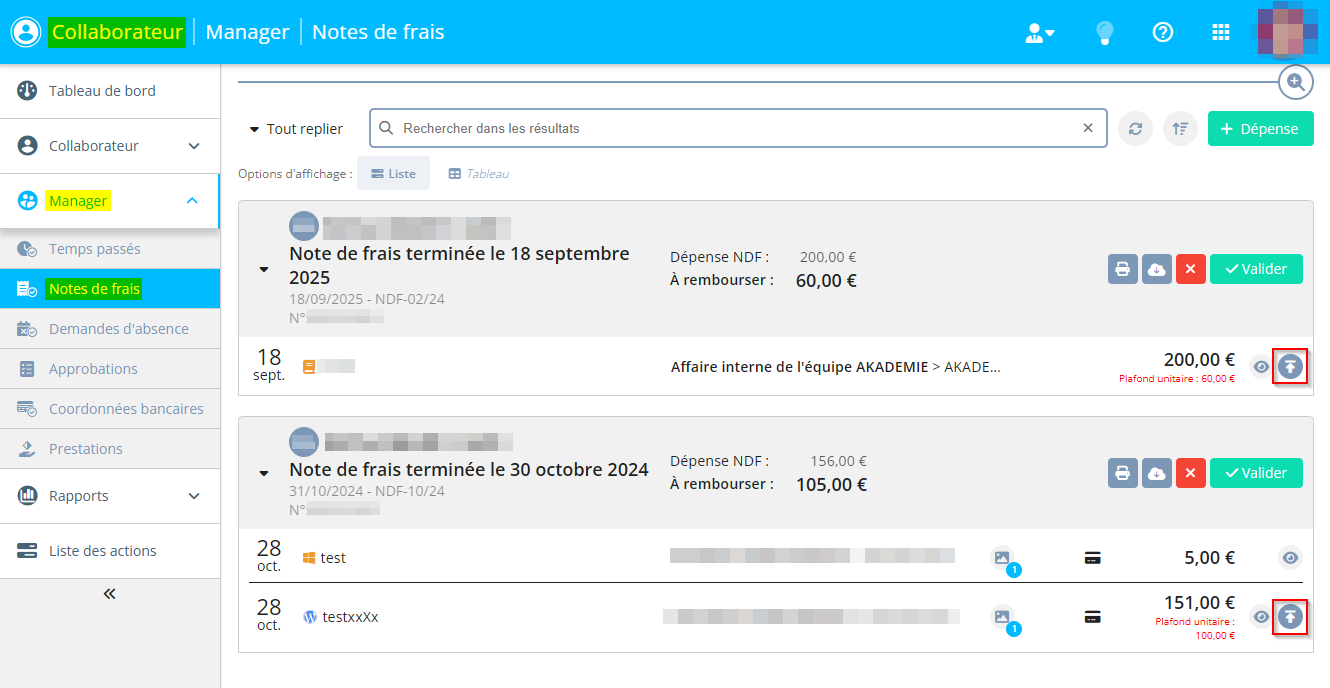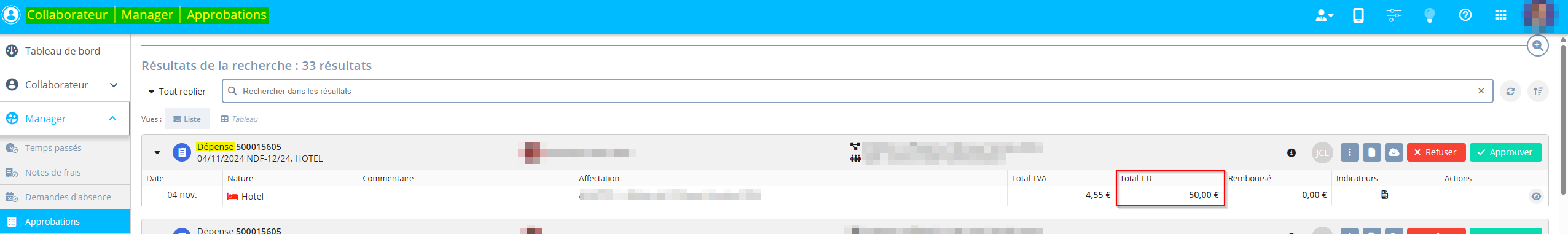 | Portail collaborateur > Manager | Employee Manager Expenses | Donne accès au menu Manager > Notes de frais du nouveau Portail Collaborateur. Ce menu Notes de frais reprend les mêmes fonctionnalités que celles disponibles dans le menu Validations > Notes de frais du Portail Collaborateur actuel avec une nouvelle interface. | 5.0.17 |