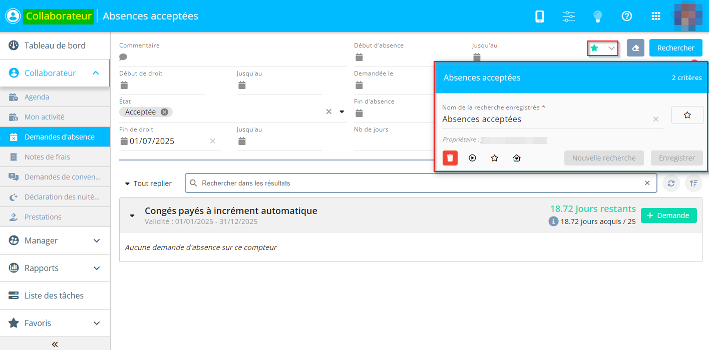 | Portail collaborateur > Manager | Employee Manager Leaves | Donne accès au menu Manager > Demandes d'absence du nouveau Portail Collaborateur. Ce menu Demandes d'absence reprend les mêmes fonctionnalités que celles disponibles dans le menu Validations > Demandes d'absence du Portail Collaborateur actuel avec une nouvelle interface. | 5.0.14 |