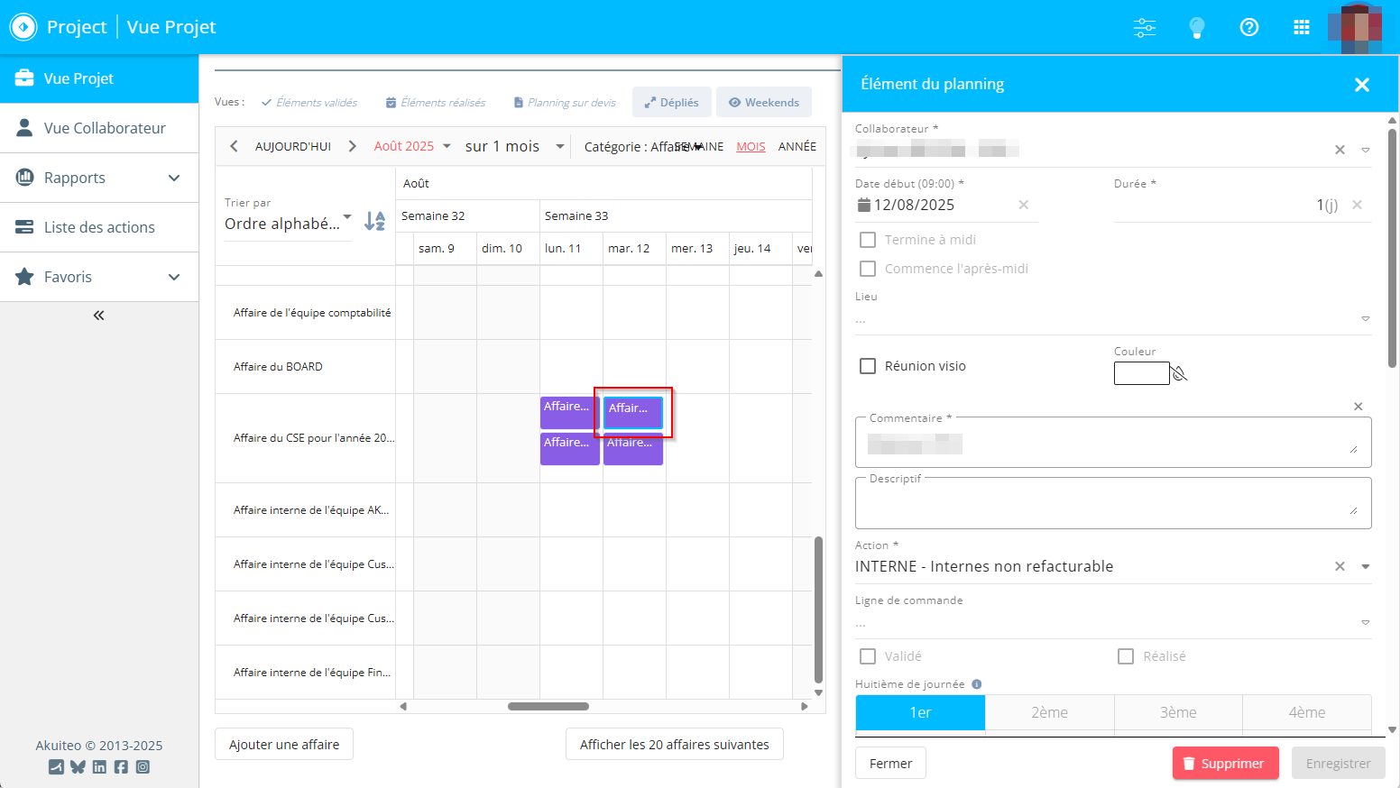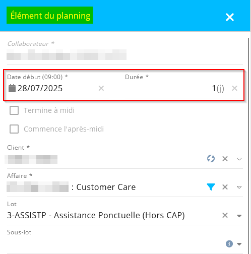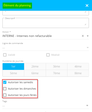Lorsque la règle de gestion PLG_DESCRIPTIF est activée, le champ Descriptif est disponible dans le formulaire des éléments de plannings.