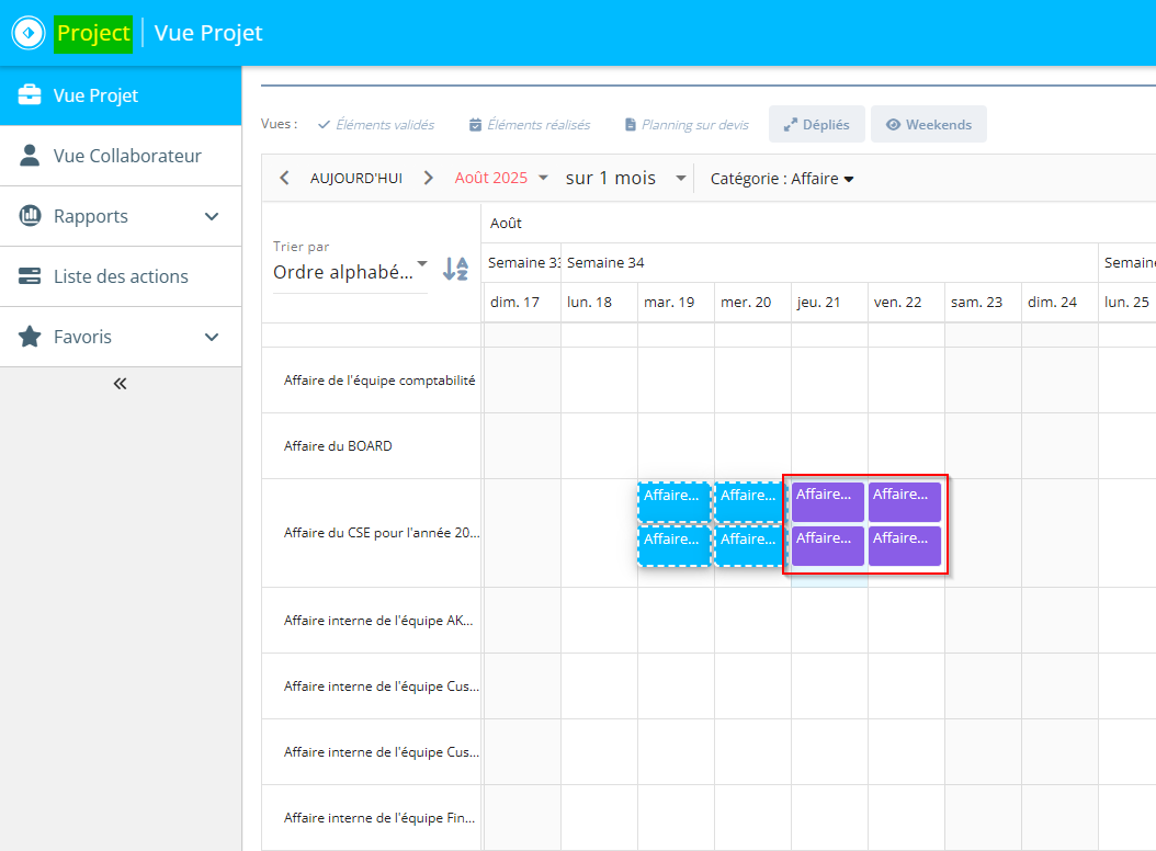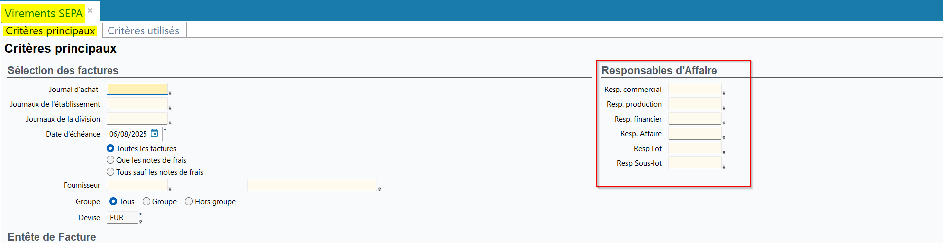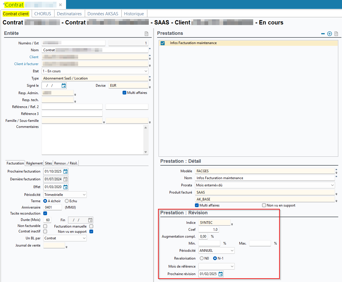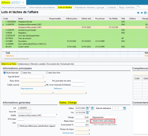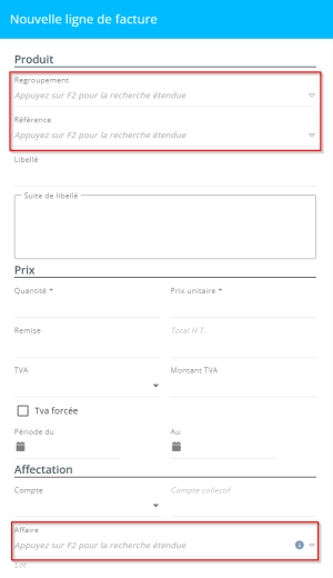 - Sur les lignes de tableaux de facturation (Gestion > Ventes > Tableaux de facturation > puis onglet Lignes > détail d'une ligne > section Détails) et les entêtes de tableaux de facturation (onglet Entête > section Affaire).