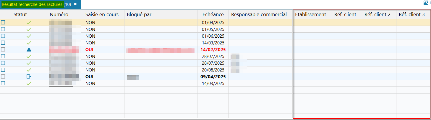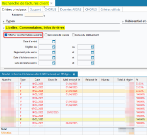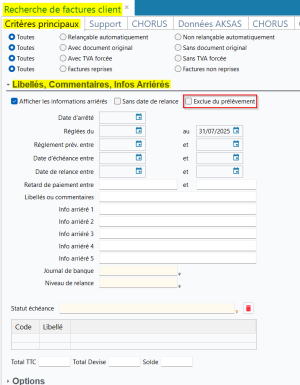 D'autre part, la case Exclue du prélèvement a été ajoutée en critère de recherche dans l'écran de recherche des factures de vente > onglet Critères principaux > section Libellés, Commentaires, Infos arriérés. La case est visible lorsque la case Afficher les informations arriérés est cochée. De plus, la colonne Exclue du prlv. a été ajoutée dans les résultats de recherche des échéances client. Elle est renseignée avec l'icône lorsqu'une échéance est exclue d'un prélèvement à venir.