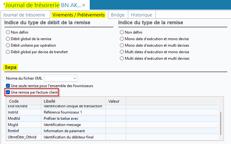 Désormais, la case Exclure du prélèvement a été ajoutée dans l'onglet Echéances > section Dates et échéances d'une facture de vente. Lorsque cette case est cochée, la ligne d'échéance est exclue du prélèvement à venir. Ainsi, l'échéance n'apparaîtra pas dans la liste du résultat de recherche des échéances à prélever (Trésorerie > Editions et traitements en lot > Prélèvements). Cette case est décochée par défaut.