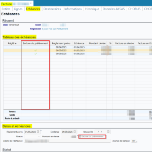 Sur les factures de ventes (Gestion > Ventes > Factures), l'onglet Echéances permet de définir les dates auxquelles un paiement doit être effectué pour régler la facture.