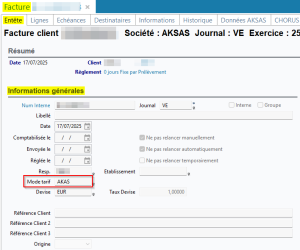 Désormais, les champs de la facture de vente suivants (onglet Entête) sont conservés sur la facture brouillon créée lorsqu'ils sont identiques sur toutes les factures à fusionner :