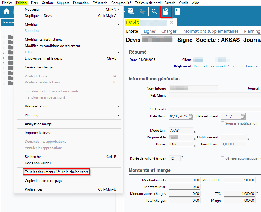 Depuis la pièce, cette fonction est accessible soit dans Edition > Tous les documents liés de la chaîne vente, soit depuis l'icône dans la barre d'action.