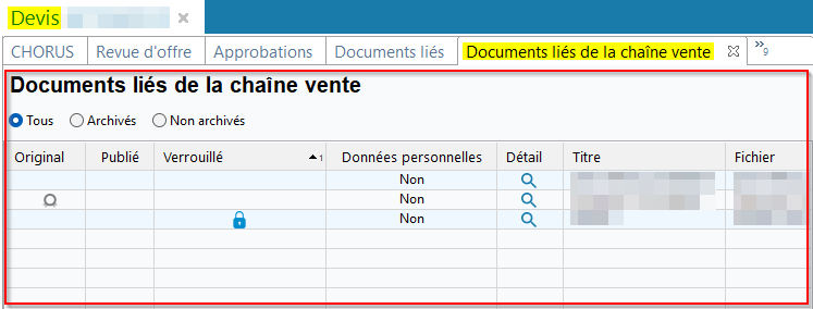 L'onglet Documents liés de la chaîne vente s'ouvre et affiche un tableau qui liste tous les documents des pièces liées au même devis que sur la pièce en cours de consultation. Si la chaîne ne comprend pas de devis lié, le tableau liste à la place les documents des pièces liées à la même commande que sur la pièce en cours de consultation.