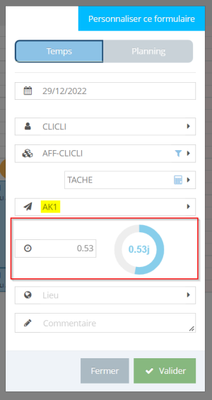 Désormais, le champ Durée est affiché en jours sur 2 décimales dans cette fenêtre au lieu d'être en heure minute. Si la règle de gestion PLG_8EME_JRNEE est également activée pour gérer la planification en huitième de journée, ce champ Durée est affiché sur 3 décimales.