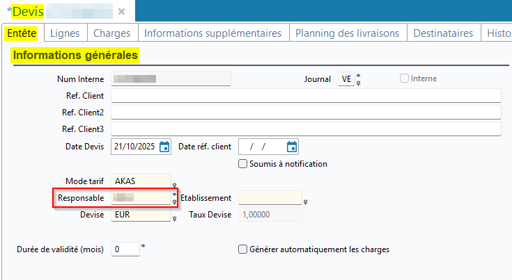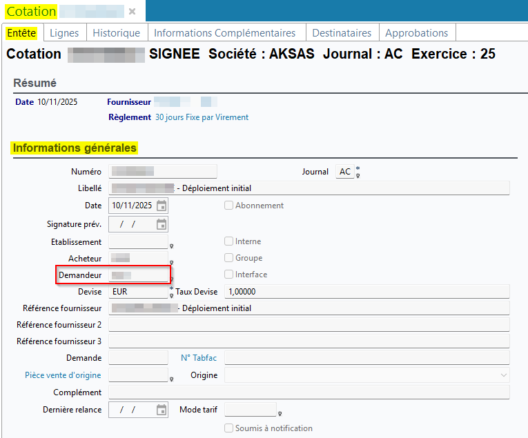 Sur une cotation (Gestion > Achats > Cotations) ou une commande fournisseur (Gestion > Achats > Commandes fournisseurs) > vue Entête > section Informations générales, le demandeur de la pièce peut être renseigné dans le champ Demandeur.