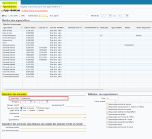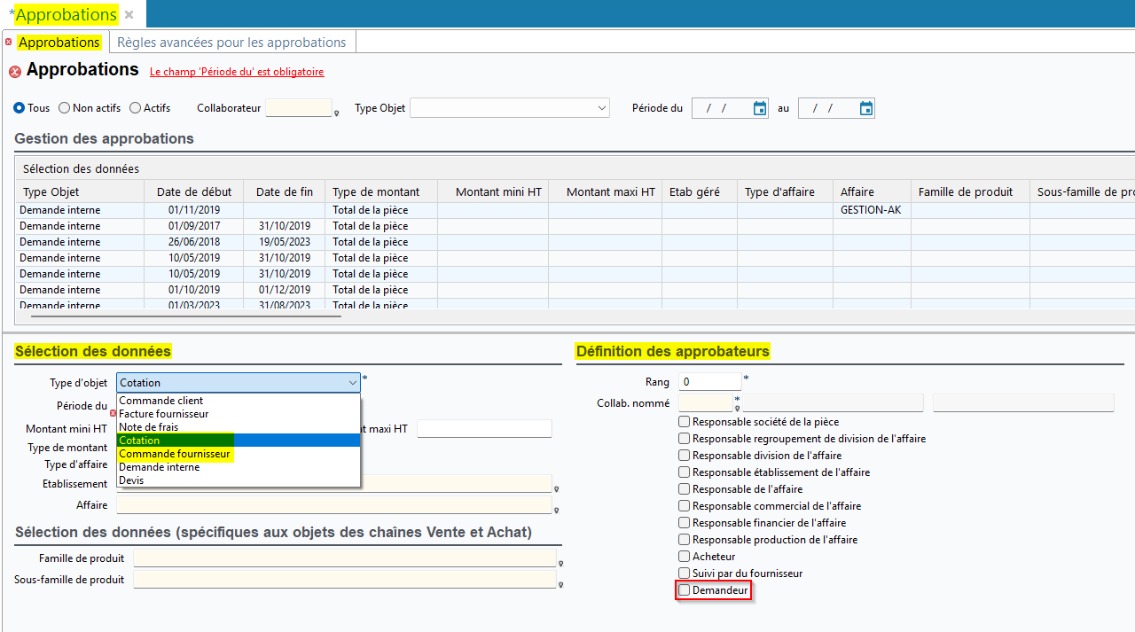Désormais, la case Demandeur a été ajoutée dans la section Définition des approbateurs pour les règles d'approbation des cotations et des commandes fournisseur (section Sélection des données > Type d'objet > Cotation et Commande fournisseur).