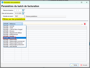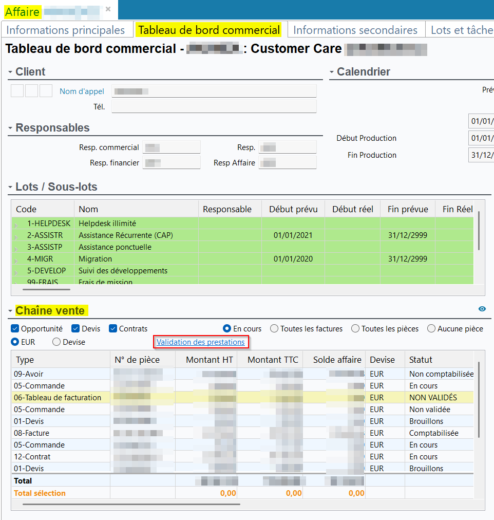 Désormais, il est également possible d'accéder à la validation des prestations depuis l'Application Desktop. L'hyperlien Validation des prestations a été ajouté dans le tableau de bord commercial d'une affaire > section Chaîne vente et lance automatiquement une recherche du module Manager > menu Prestations avec le critère de recherche Affaire renseigné avec le nom de l'affaire en cours de consultation.