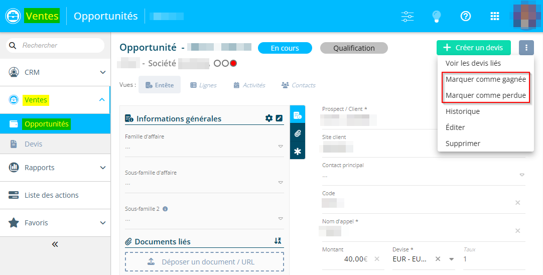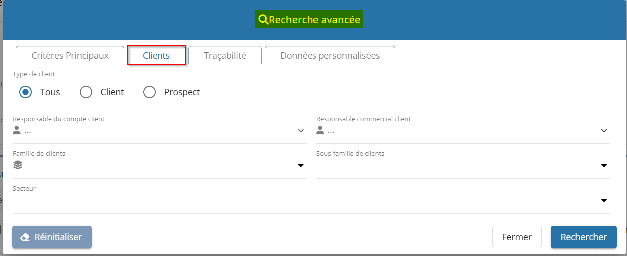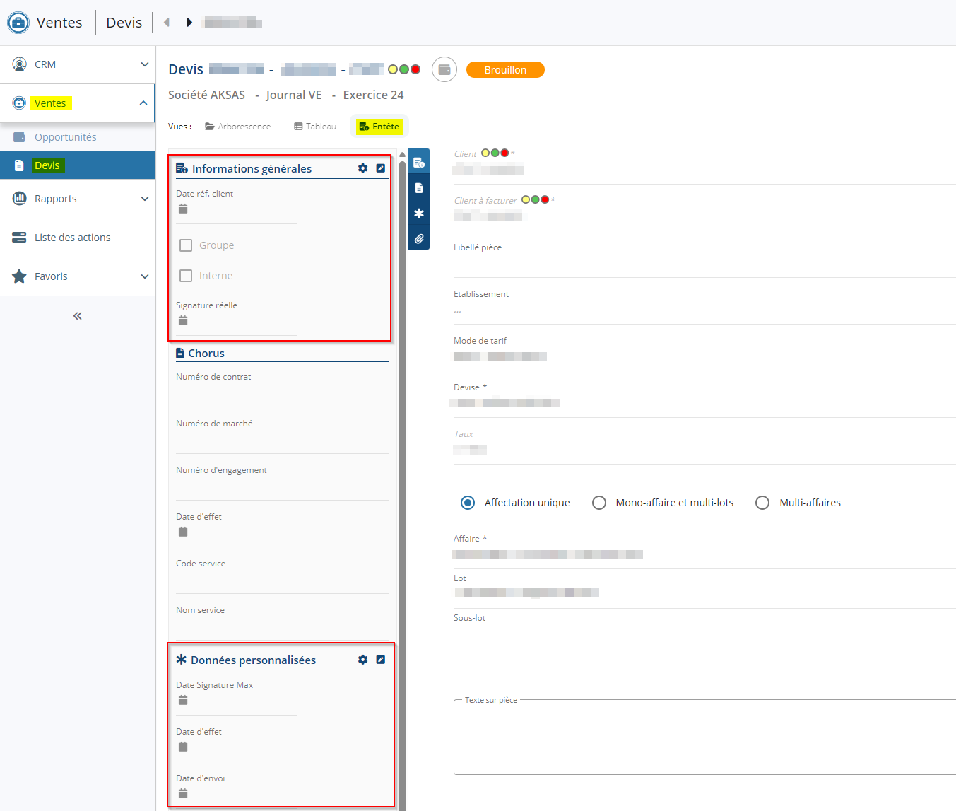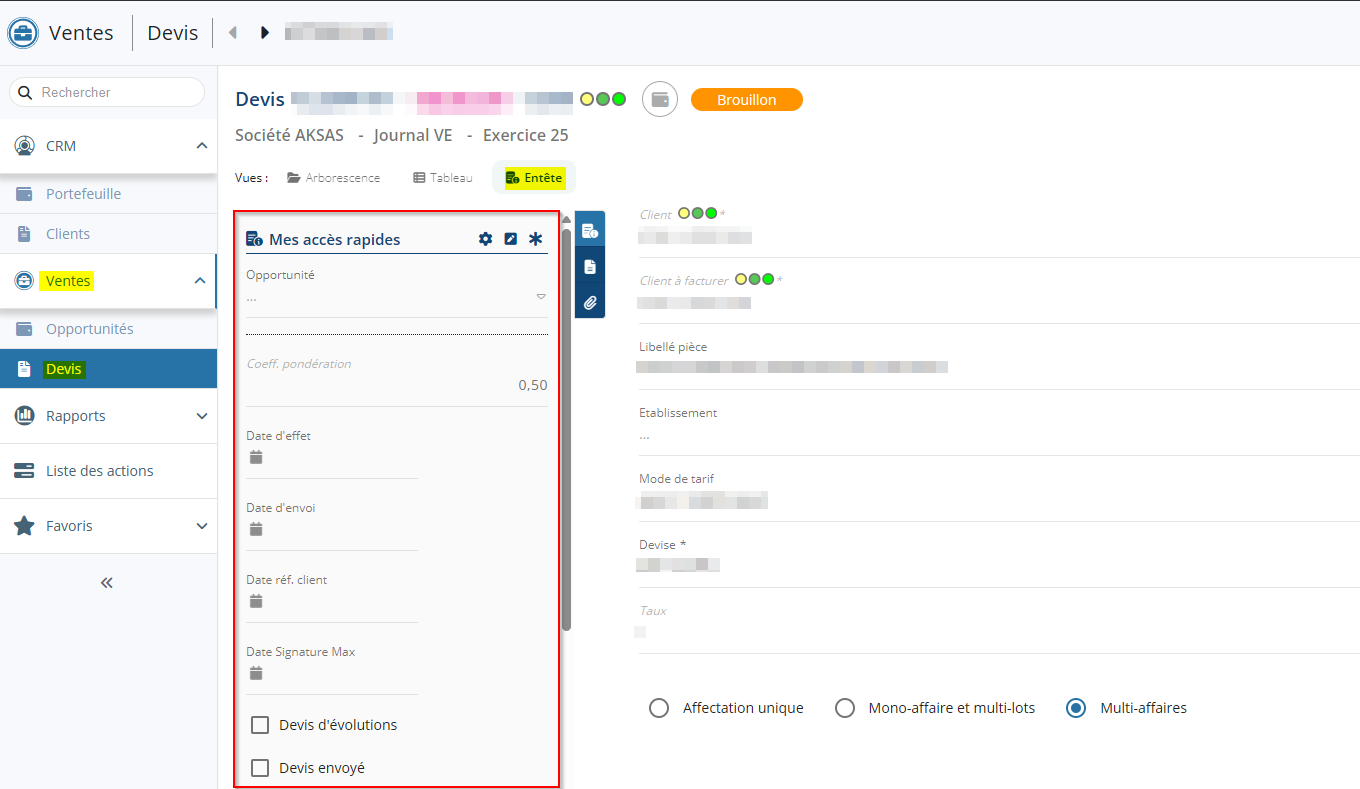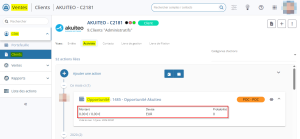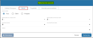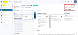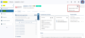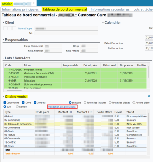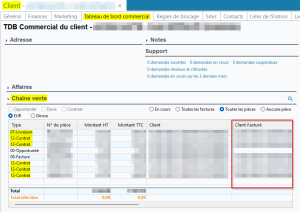 Auparavant, depuis l'onglet Tableau de bord commercial > section Chaîne vente des clients/prospects (Tiers > Clients / Prospects) et des affaires (Gestion > Affaires), la colonne Client Facturé affichait le client facturé uniquement pour les factures et était vide pour les autres pièces.