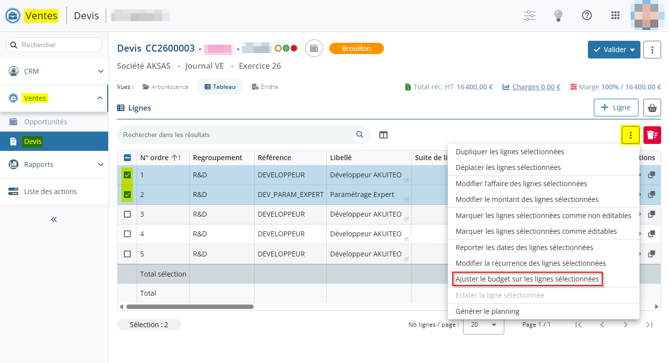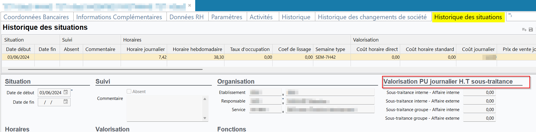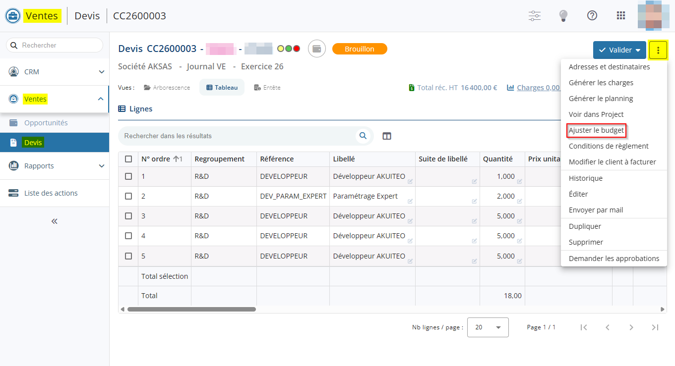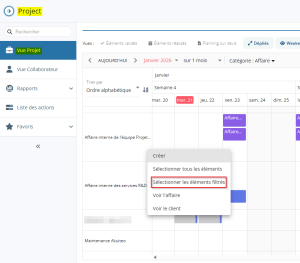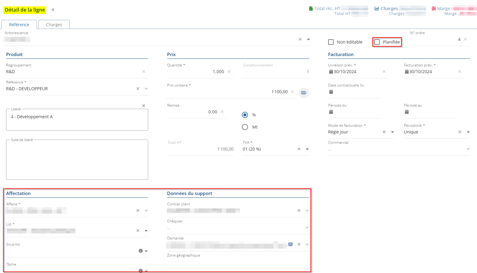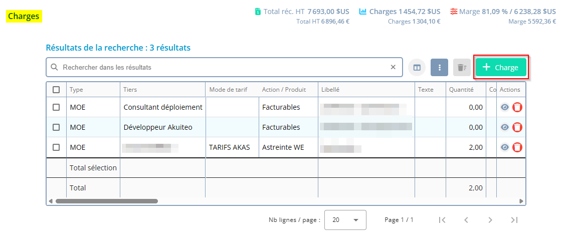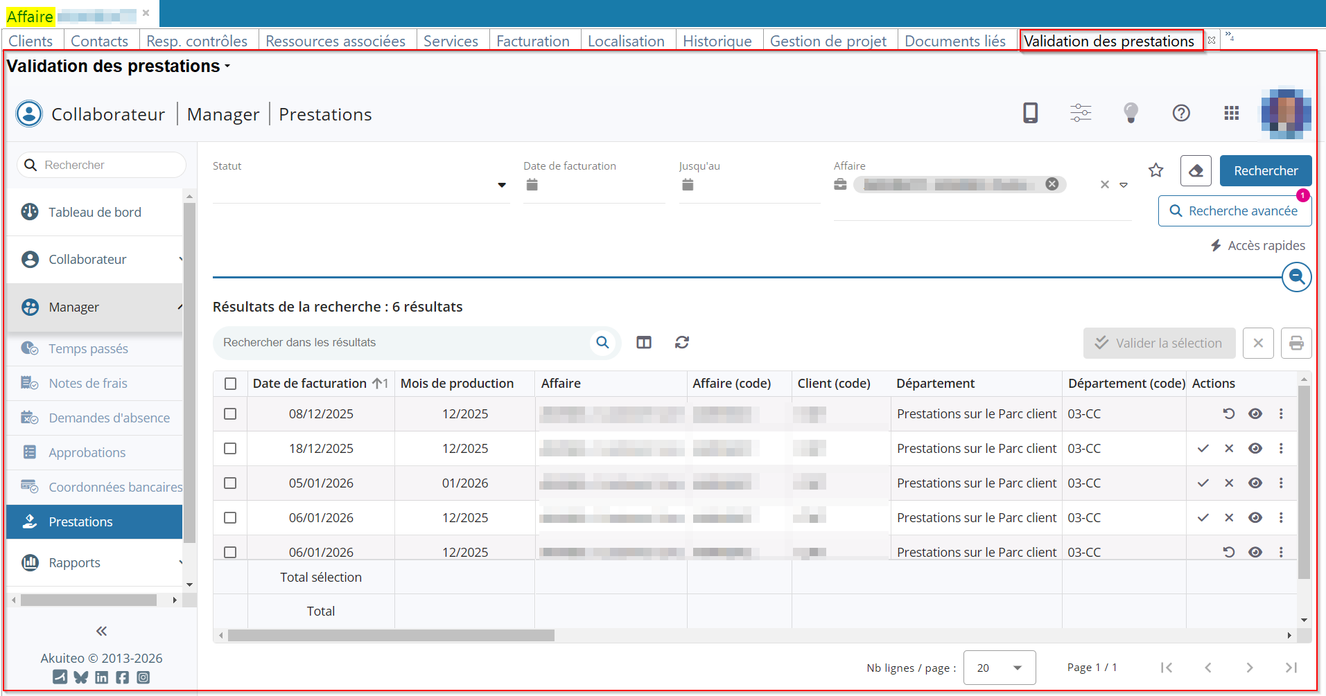 Si l'utilisateur possède les droits nécessaires, les fonctionnalités associées aux prestations peuvent être effectuées depuis cet onglet (par exemple, valider ou refuser une prestation).