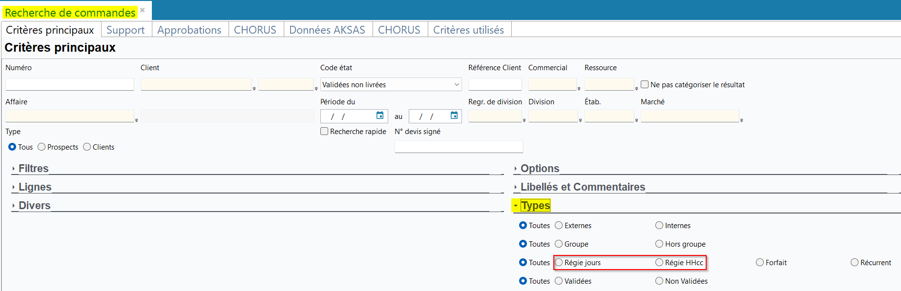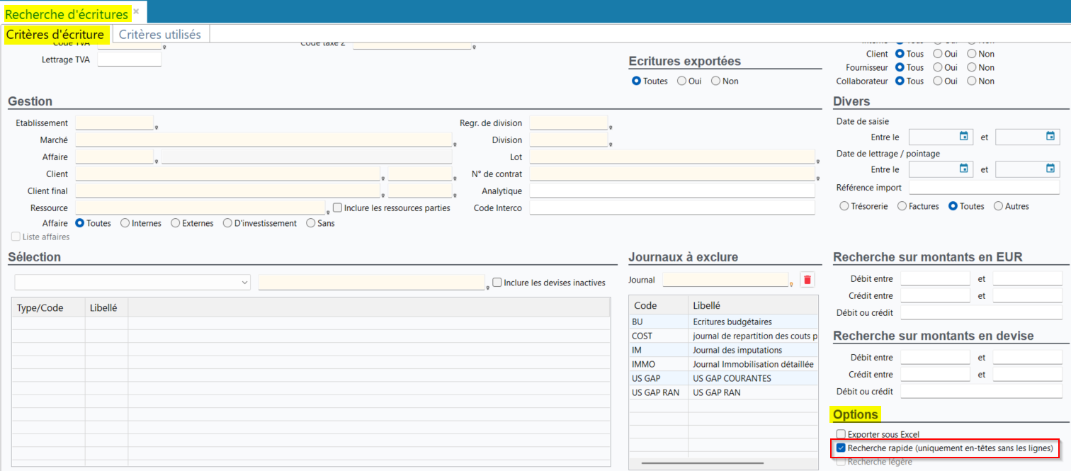 Dans l'écran de recherche des écritures (Comptabilité > Ecritures > Ecritures), le critère de recherche Recherche rapide a été remplacé par le critère de recherche Recherche rapide (uniquement en-têtes sans les lignes) dans l'onglet Critères d'écriture > section Options.