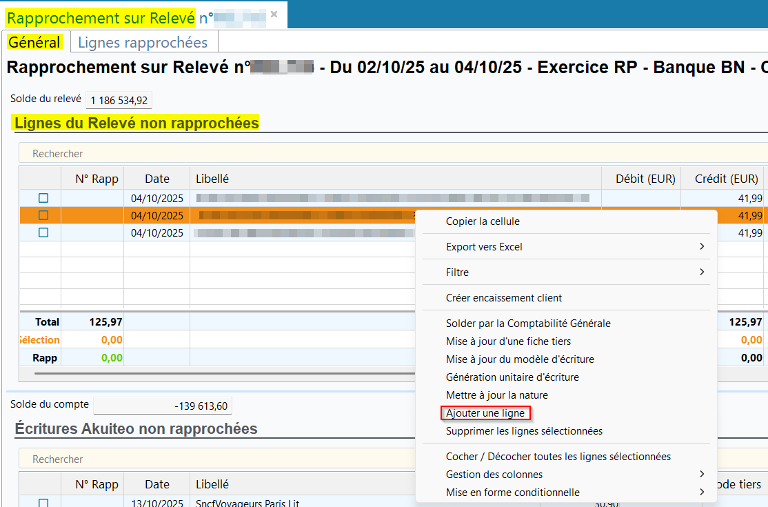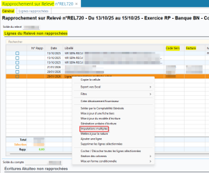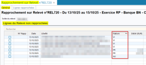 Après l'import d'un relevé bancaire, certains codes d'opération ne sont pas reconnus et les lignes importées correspondantes sont donc associées à la nature AU (Autres) par défaut (onglet Général > section Lignes du Relevé non rapprochées > colonne Nature).
