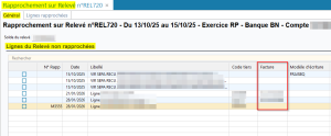 Après l'import d'un relevé bancaire, le tiers de chaque ligne importée (onglet Général > section Lignes du Relevé non rapprochées > colonne Code tiers) est déterminé et renseigné automatiquement :