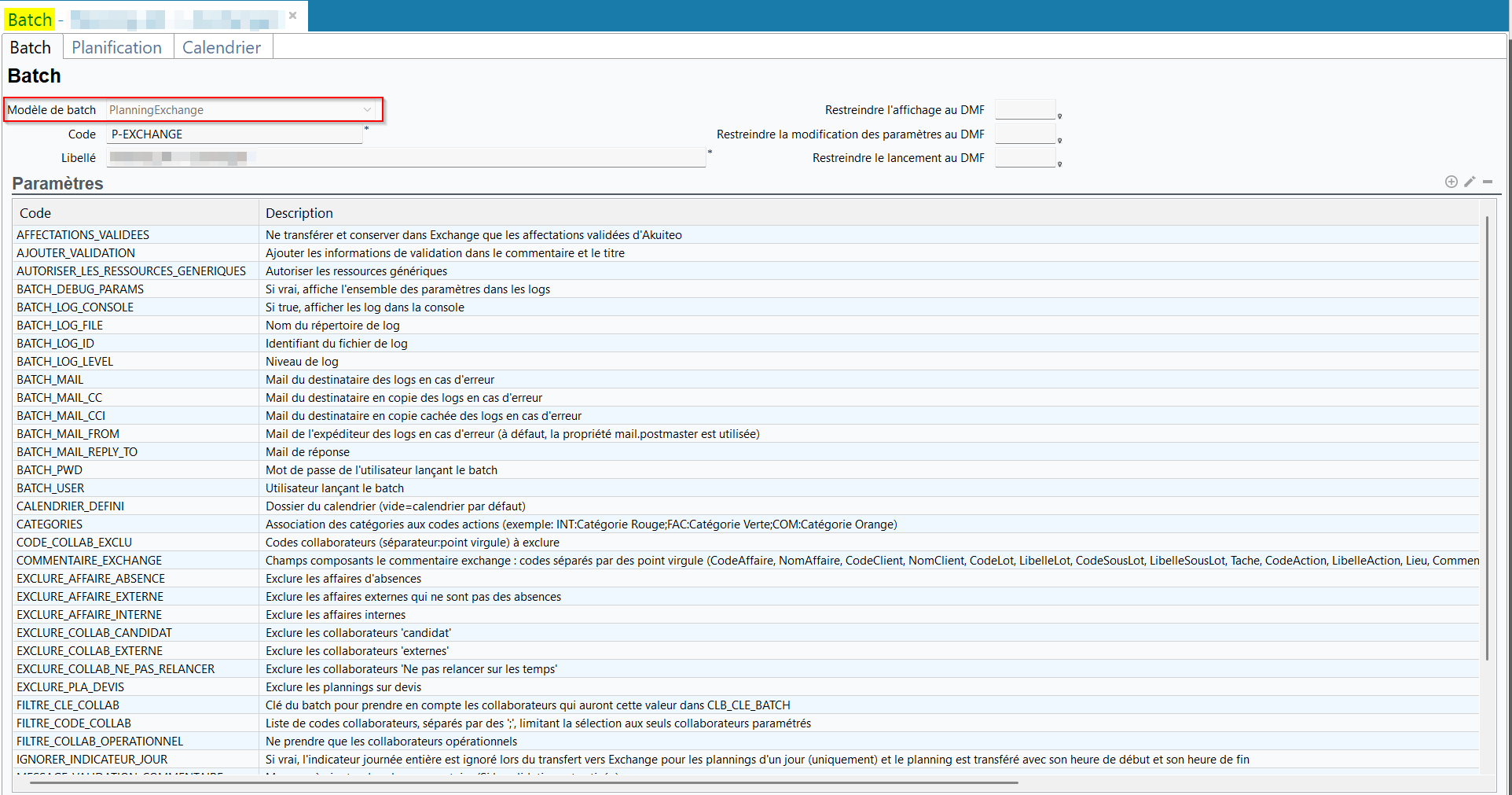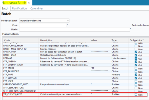 Dans le batch ImportReleveBancaire (Outils > Paramétrage > Batchs > Batch création et modification), le paramètre VIR_CLIENTS_AUTO a également été ajouté et correspond à l'option Création automatique des virements clients. Le paramètre peut être défini sur Vrai ou Faux en fonction de si l'option doit être activée ou non pour les imports de relevés effectués par le batch.