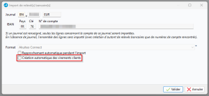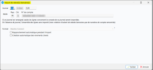 Sur la fenêtre d'import, l'option Création automatique des virements clients a été ajoutée et permet de créer automatiquement les encaissements clients correspondant aux virements et de les imputer à la facture respective.