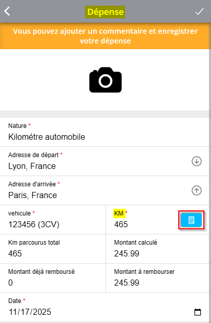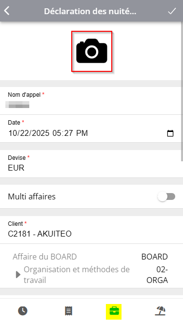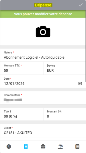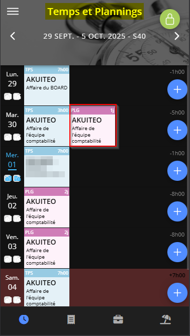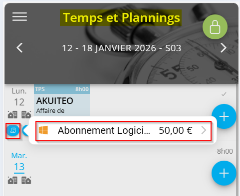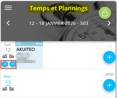 Une dépense ou une demande interne peut être créée depuis un bloc de temps passé ou de planning sur Akuiteo Mobile > menu Temps et Plannings en touchant le bloc concerné puis en touchant + DÉPENSE ou + DEMANDE.