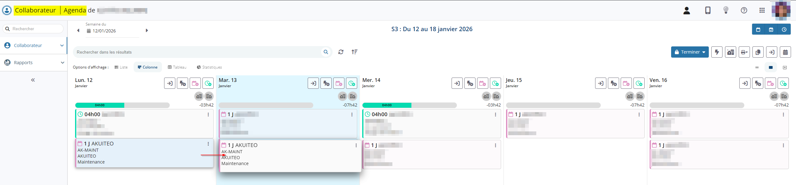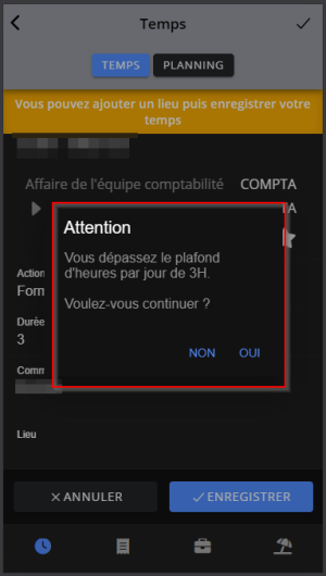 Désormais, sur Akuiteo Mobile, le collaborateur est averti ou bloqué (en fonction du paramétrage) lorsqu'il transfère un élément de planning dans les temps passés et que le nombre d'heures maximum est dépassé.