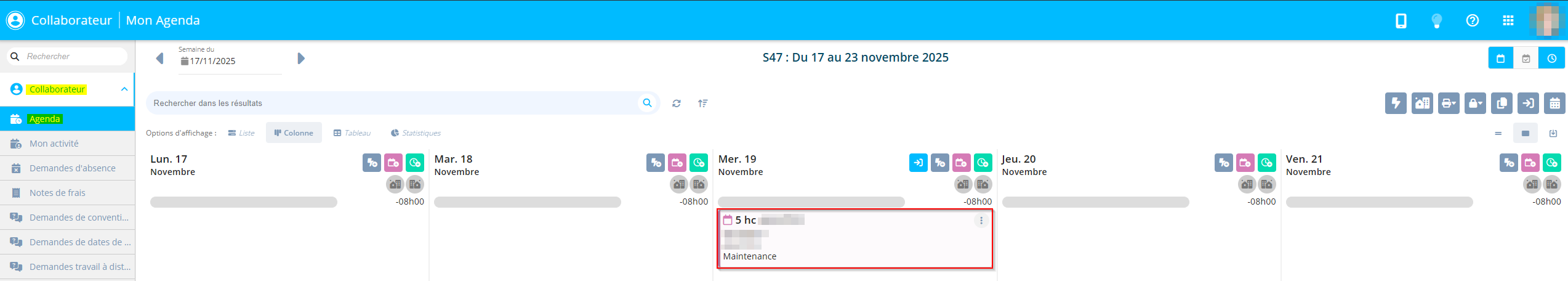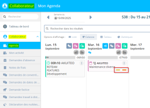 Désormais, les icônes suivantes sont affichées sous les icônes de télétravail de la journée concernée lorsqu'une dépense ou une demande interne est liée :