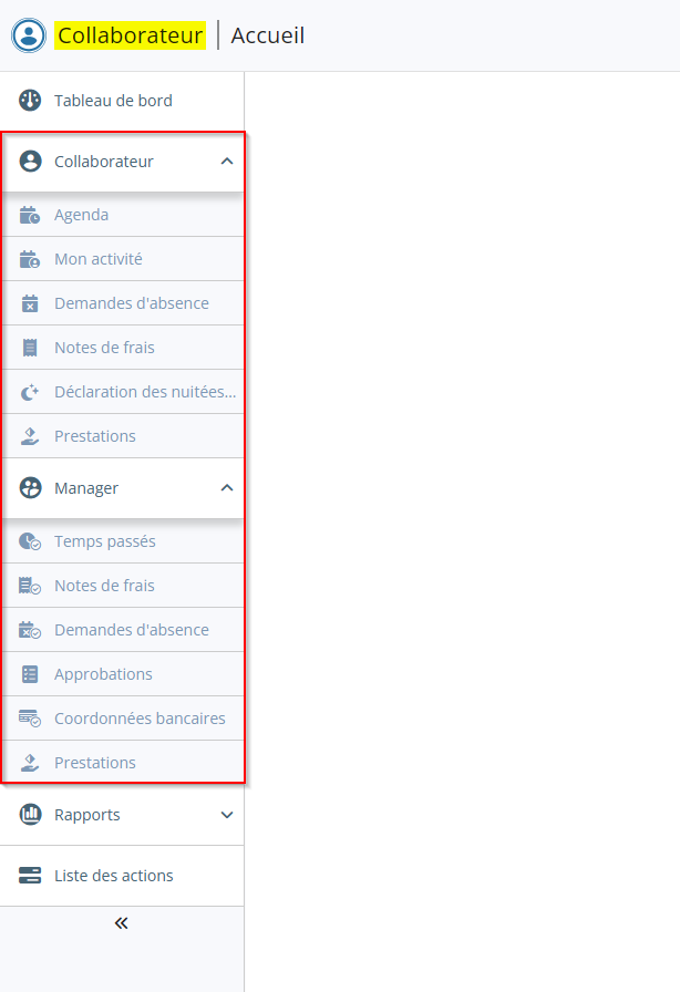 | Portail collaborateur > Manager | Employee Manager Times | Donne accès au menu Manager > Temps passés du nouveau Portail Collaborateur. Ce menu Temps passés reprend les mêmes fonctionnalités que celles disponibles dans les menus de contrôle et de validation des temps passés du Portail Collaborateur actuel avec une nouvelle interface. | 5.0.24 |