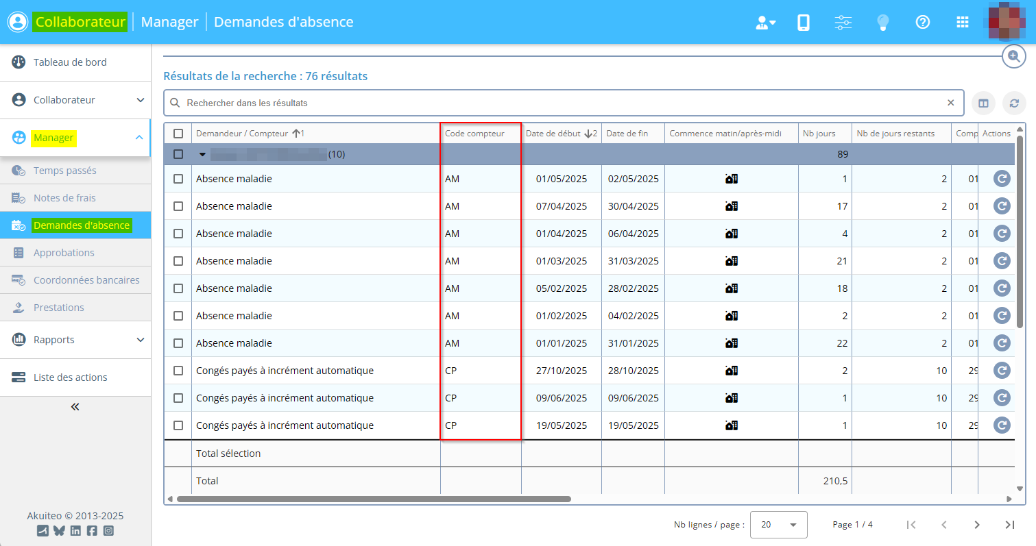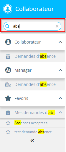 | Portail collaborateur > Manager | Employee Manager Leaves | Donne accès au menu Manager > Demandes d'absence du nouveau Portail Collaborateur. Ce menu Demandes d'absence reprend les mêmes fonctionnalités que celles disponibles dans le menu Validations > Demandes d'absence du Portail Collaborateur actuel avec une nouvelle interface. | 5.0.14 |