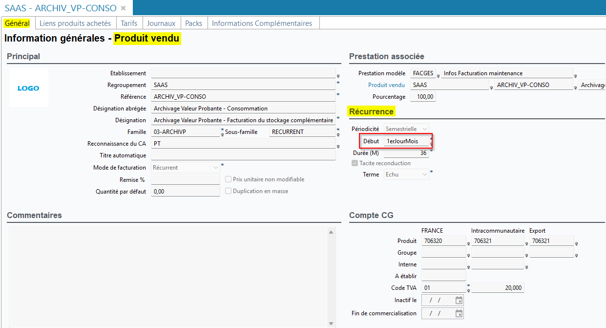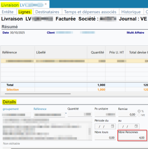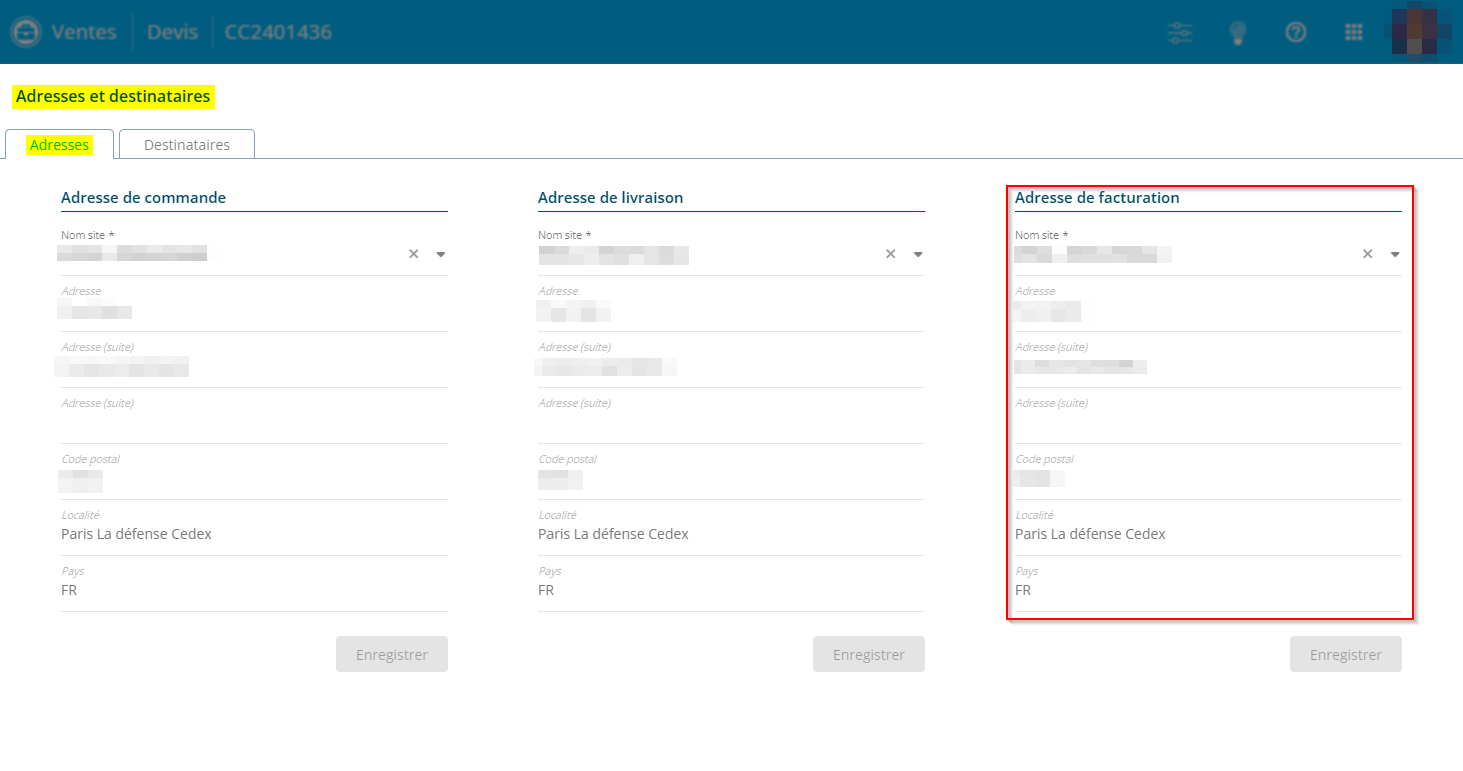 Auparavant, lorsque le site de facturation d'une facture (Gestion > Ventes > Factures > onglet Entête > section Client) était modifié, un message d'information demandait à l'utilisateur de vérifier manuellement si les destinataires de la facture devaient être modifiés (onglet Destinataires).
